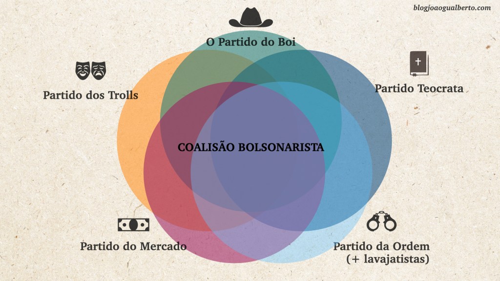 Na medida em que a coalizão se formava, iam se congregando em torno do bolsonarismo os atores da internet pelos quais ele depois ficaria conhecido: as contas de Twitter e Facebok alinhadas com os perfis dos filhos de Bolsonaro e os alunos de Olavo de Carvalho, marcados por uma combinação peculiar de fundamentalismo cristão, anticomunismo e concepção conspiratória de política, os terraplanistas, os monarquistas iam formando os quadros do movimento que levou Bolsonaro ao poder. Todos contra o que costumam chamar de hegemonia cultural da esquerda e a chamada por eles de hegemonia marxista.